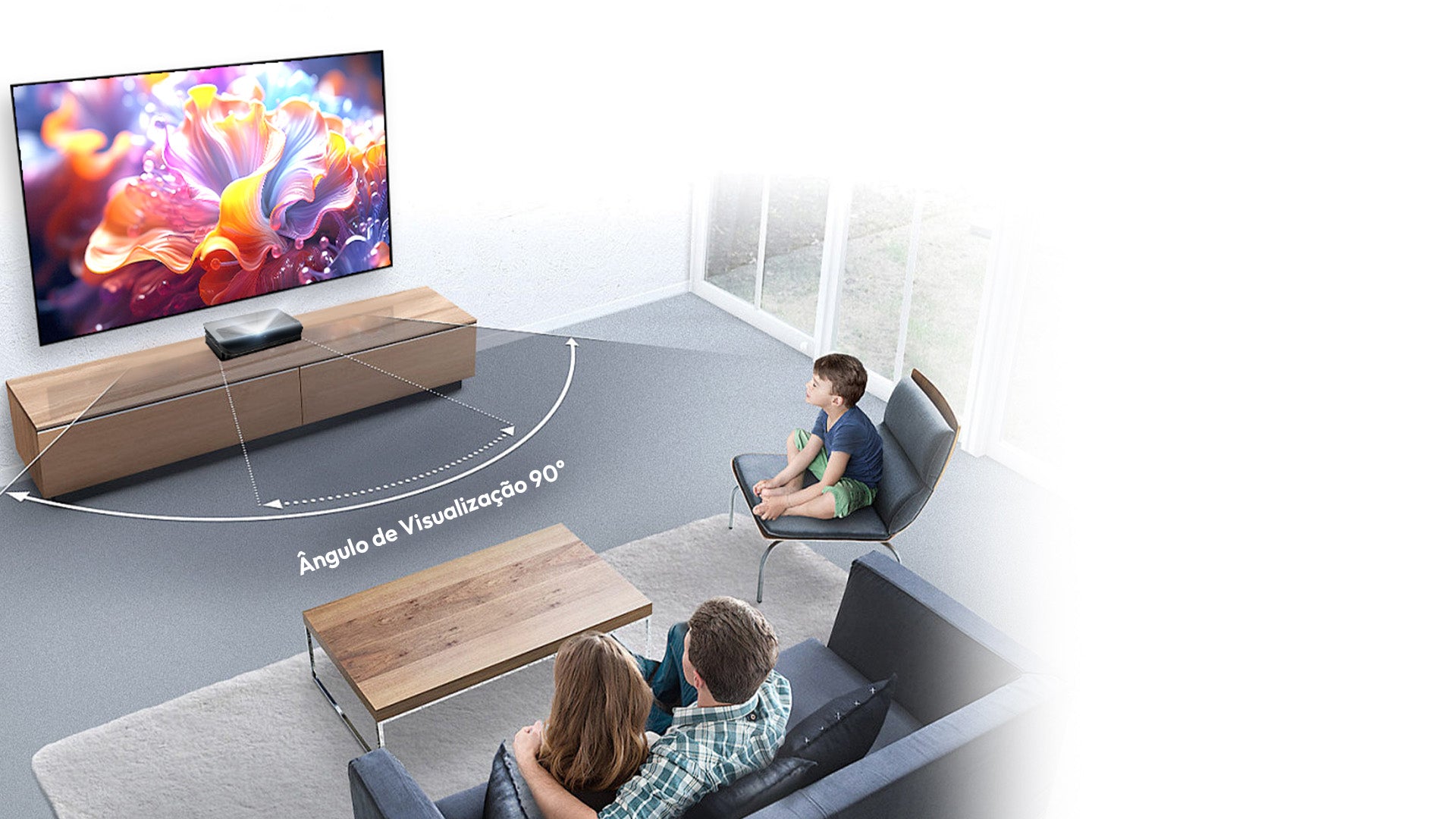 - Em ambientes bem iluminados: telas ALR (com rejeição de luz ambiente) podem apresentar um ganho ligeiramente inferior ao de paredes brancas, mas compensam com uma rejeição superior à interferência de luz externa. Isso eleva drasticamente o contraste e a nitidez da imagem, tornando-os ideais para home theaters premium no dia a dia brasileiro.