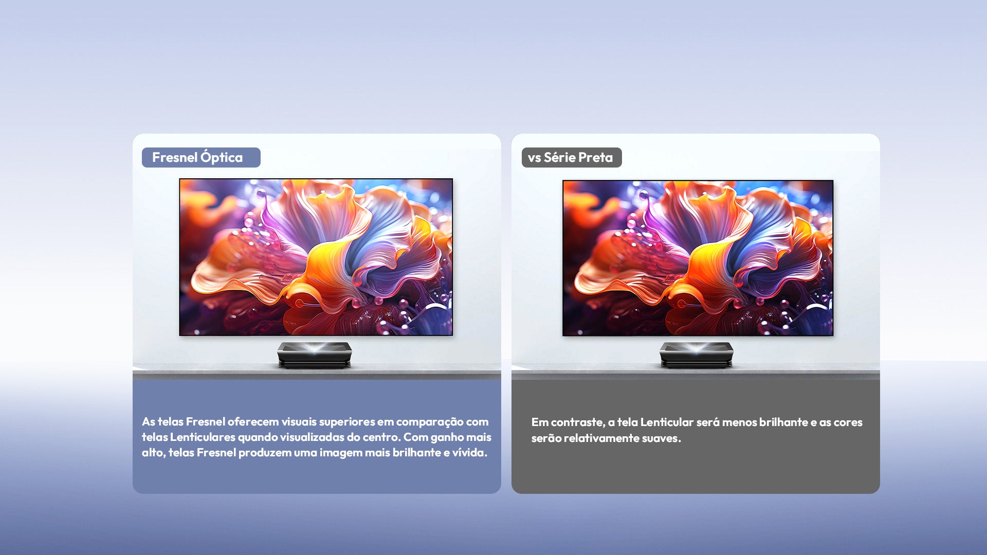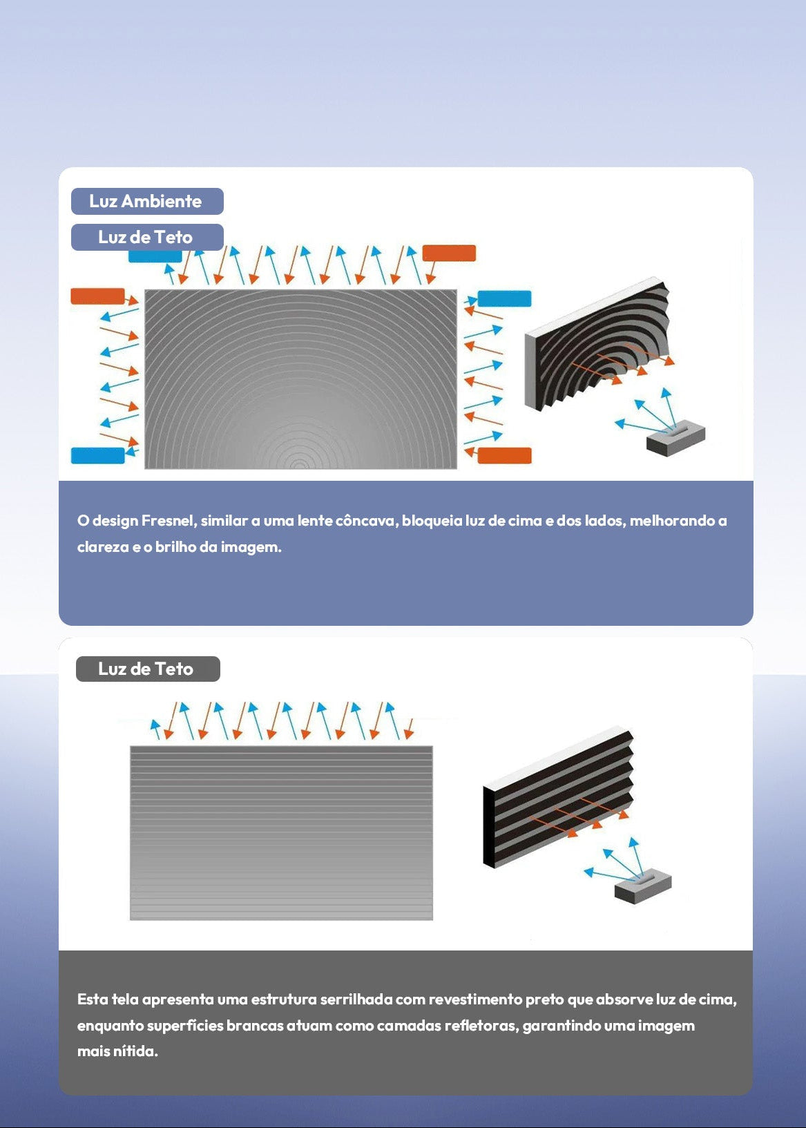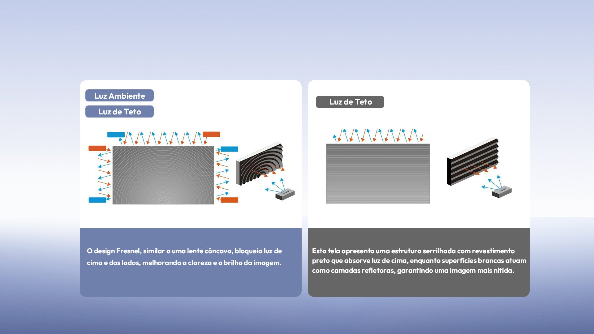 A Tela Fresnel ALR eleva imagens de projetores UST em ambientes iluminados. Sua estrutura de 8 camadas ópticas com lentes Fresnel amplifica brilho e contraste, bloqueando luz ambiente. Ideal para salas sofisticadas, garante visuais imersivos dia ou noite.