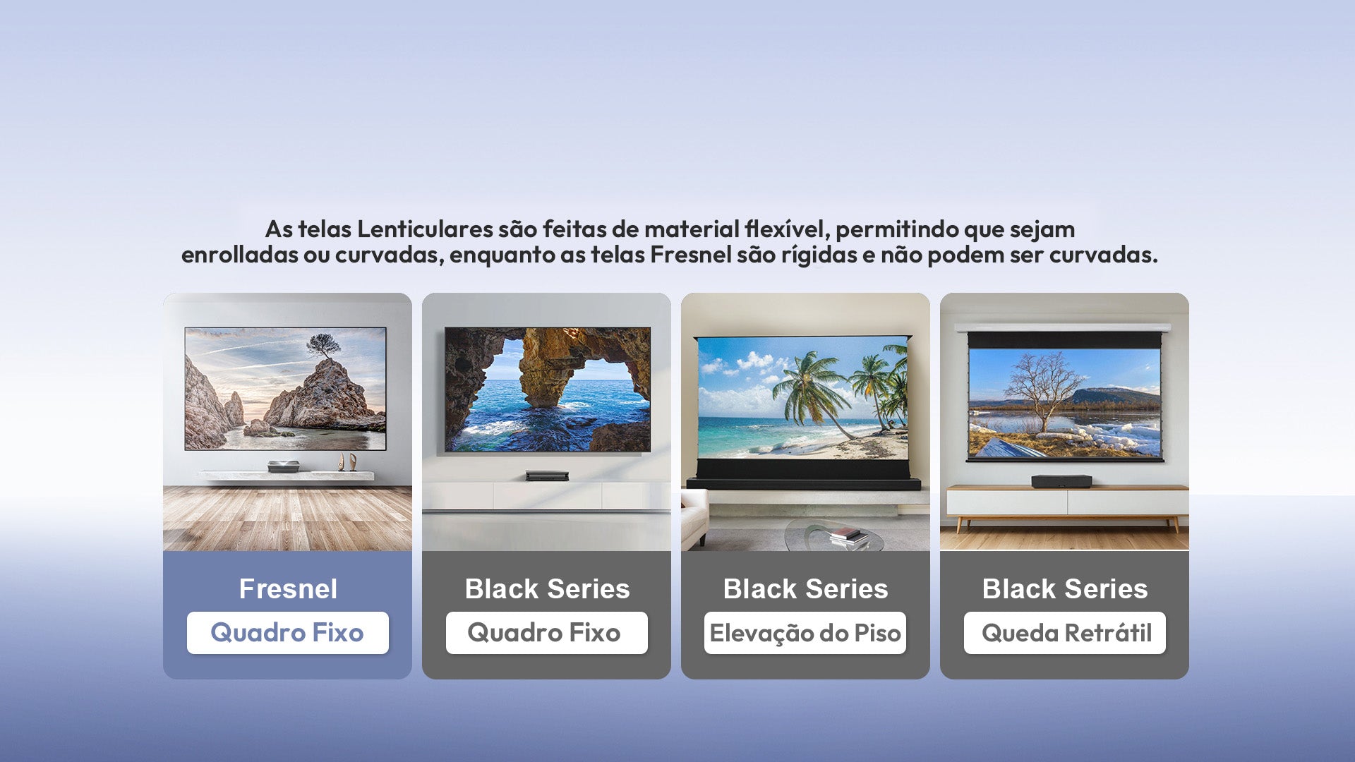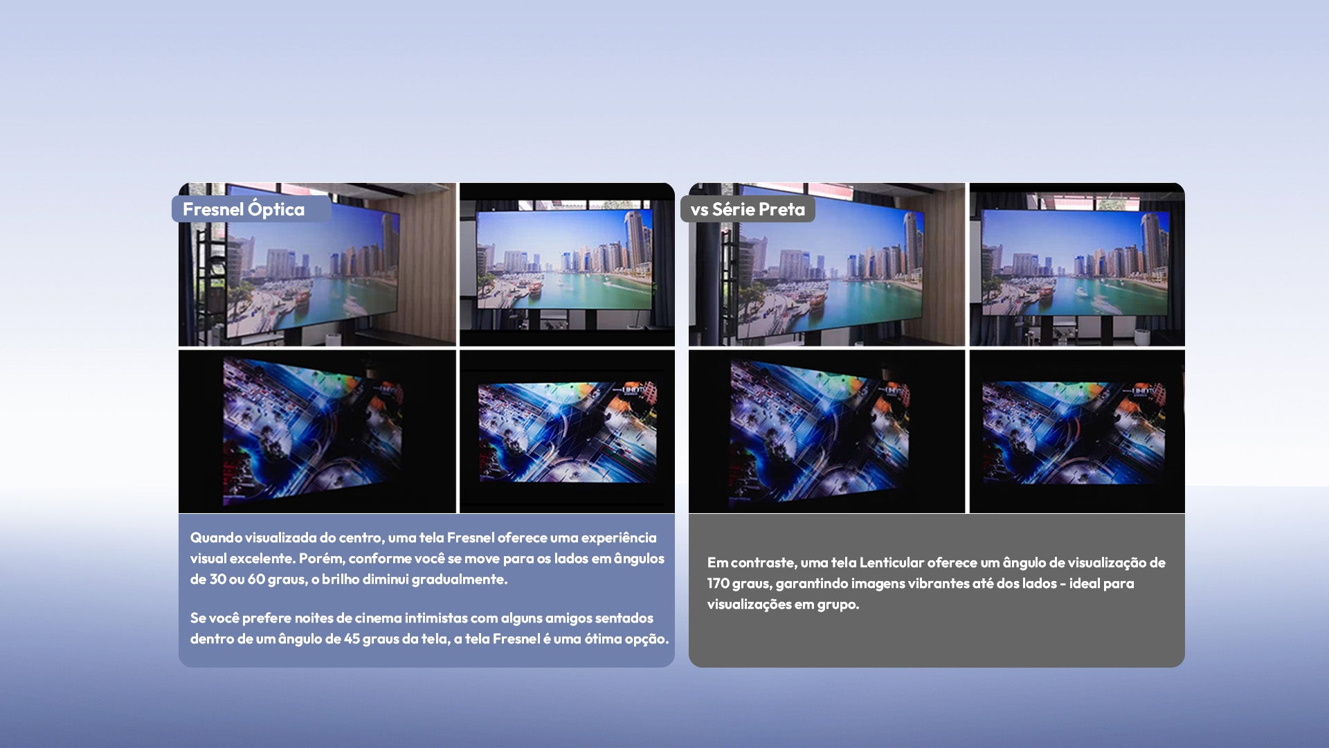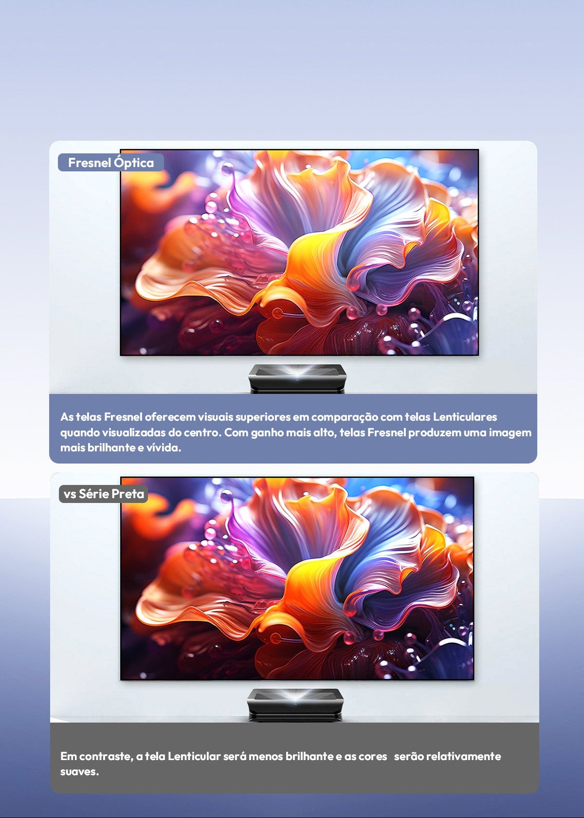 A Tela Fresnel ALR eleva imagens de projetores UST em ambientes iluminados. Sua estrutura de 8 camadas ópticas com lentes Fresnel amplifica brilho e contraste, bloqueando luz ambiente. Ideal para salas sofisticadas, garante visuais imersivos dia ou noite.