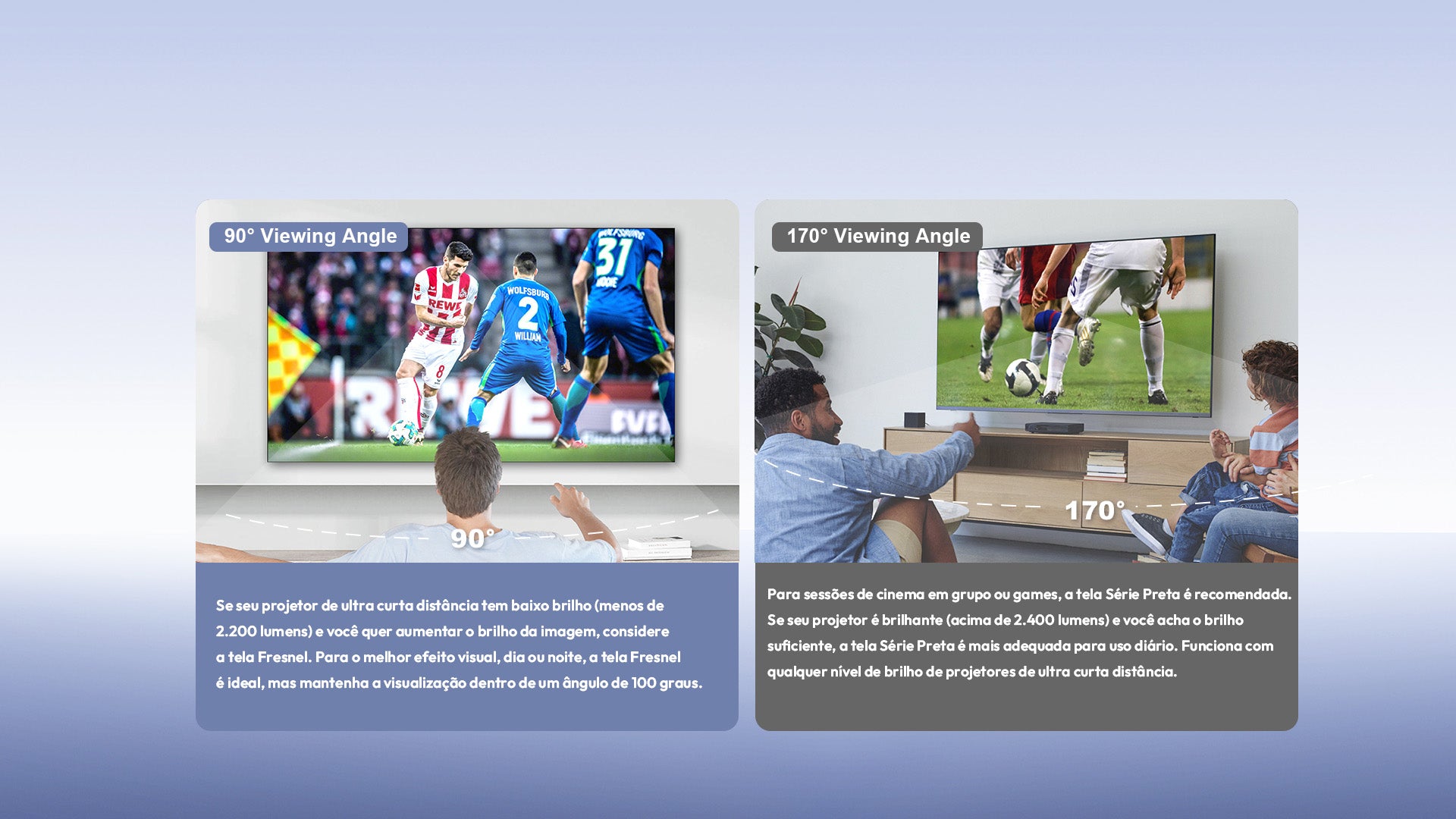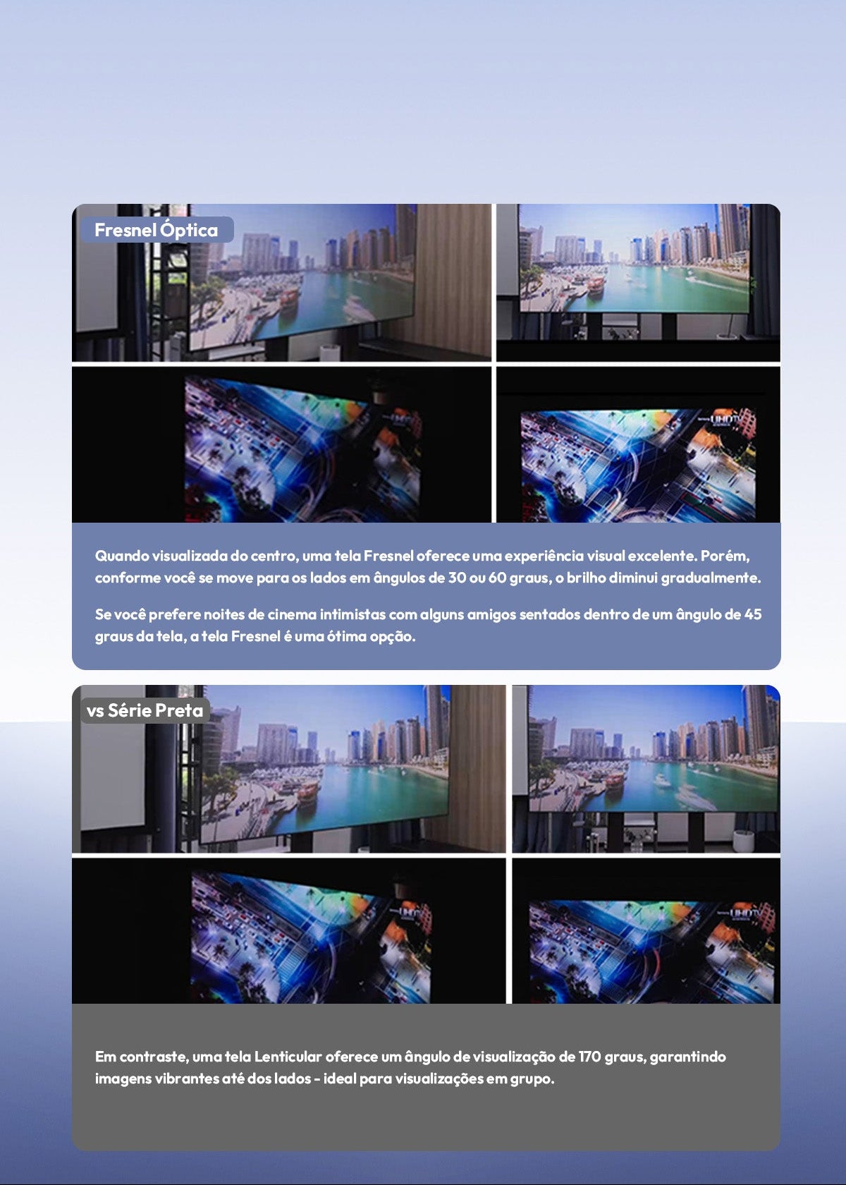 - Em salas estreitas ou setups individuais: telas de alto ganho são excelentes, pois maximizam o brilho sem comprometer a experiência solo.