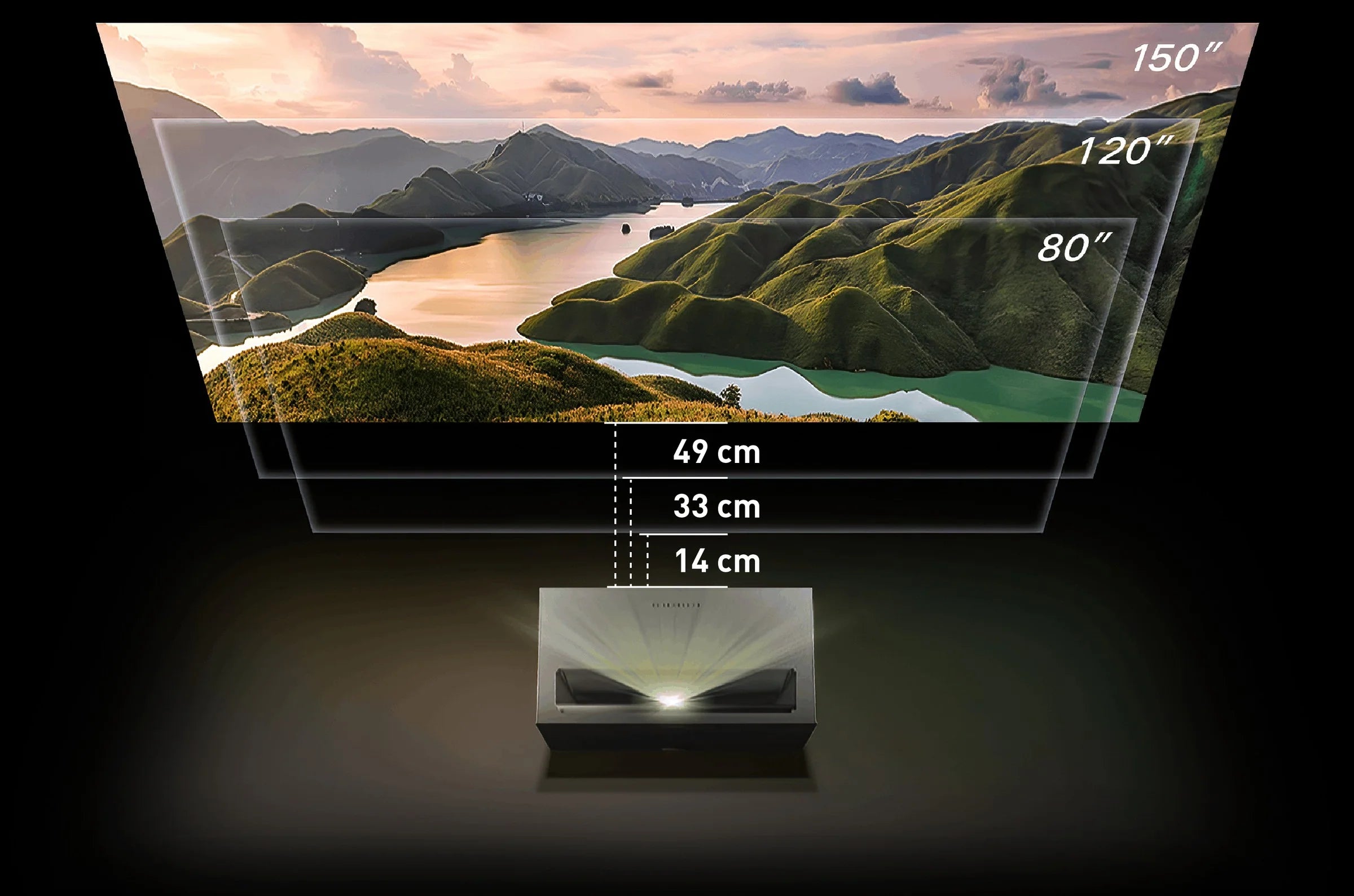 - Projeção de Curto Alcance para Imagens Grandes: A proporção de projeção é de 0,23:1, permitindo a projeção de uma tela de 100 polegadas com uma distância de projeção ultra curta de apenas 9 polegadas.