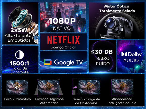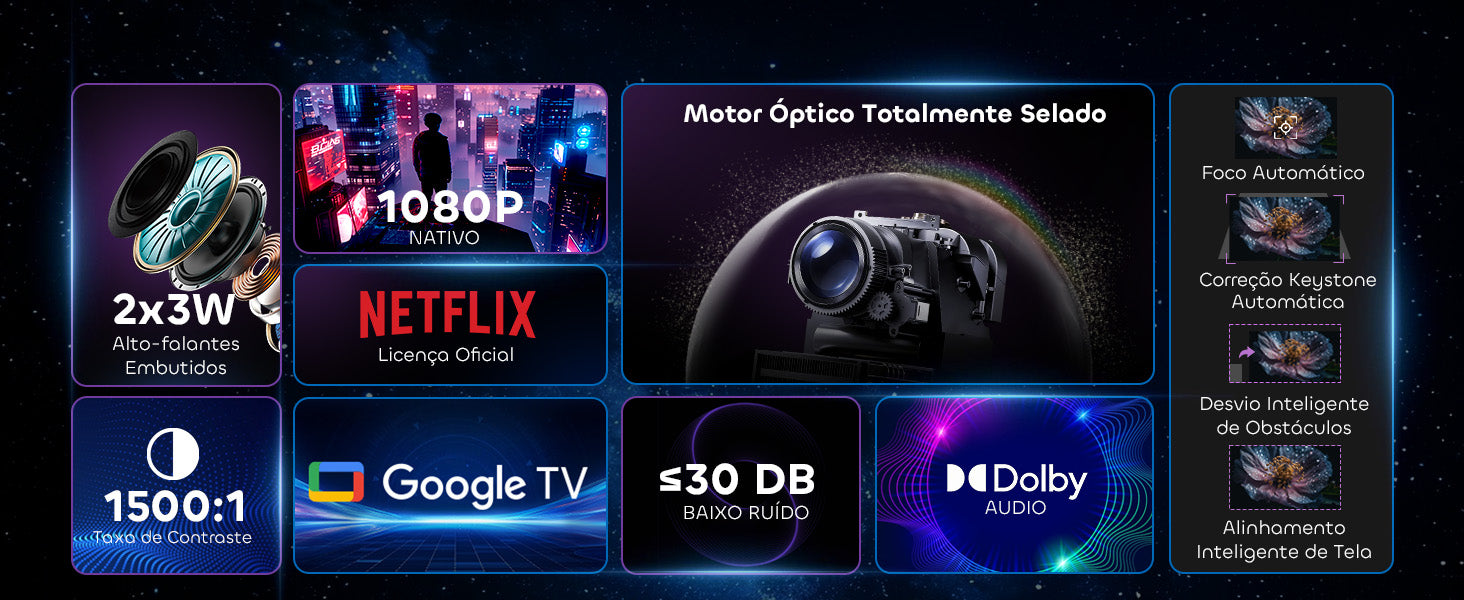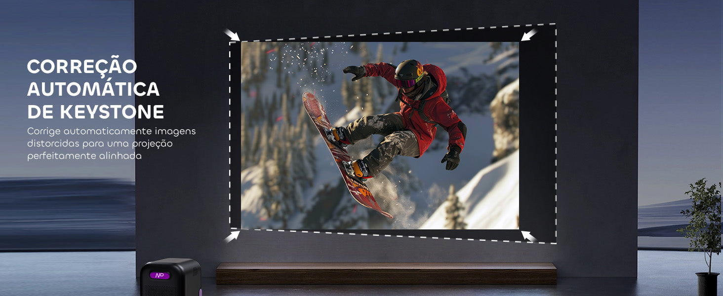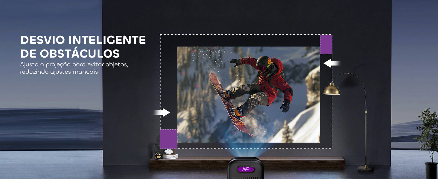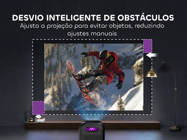 Esqueça ajustes complicados. Com seu Sistema de Ajuste Inteligente, este projetor realiza foco automático, correção keystone, evitação de obstáculos e alinhamento de tela — tudo automaticamente. Coloque-o, ligue-o, e ele otimiza a imagem para você.