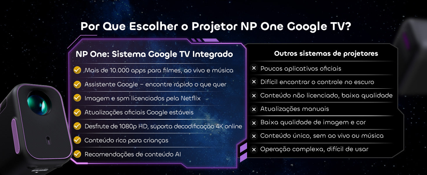 O NothingProjector One Smart é seu projetor inteligente completo, equipado com Google TV e suporte nativo à Netflix. Transmita mais de 10.000+ apps diretamente — sem adaptadores ou atrasos. De filmes e jogos a maratonas no YouTube, tudo está a um toque de distância.