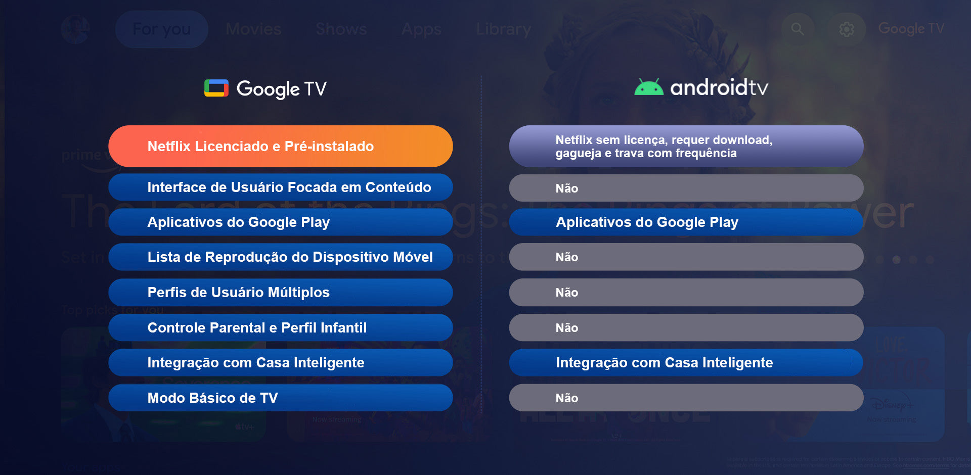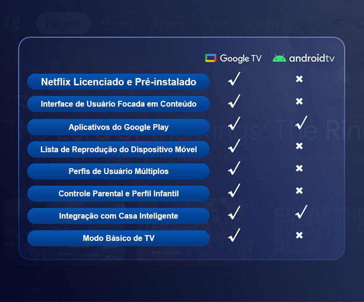 O Google TV é uma evolução da plataforma Android TV. Enquanto o Android TV foca em aplicativos individuais, o Google TV aprimora a experiência do usuário ao curar conteúdo de diferentes serviços de streaming e fornecer uma interface mais integrada. Além do aplicativo Netflix licenciado, ele também inclui novos recursos como Lista de Assistidos, múltiplos perfis e muito mais.