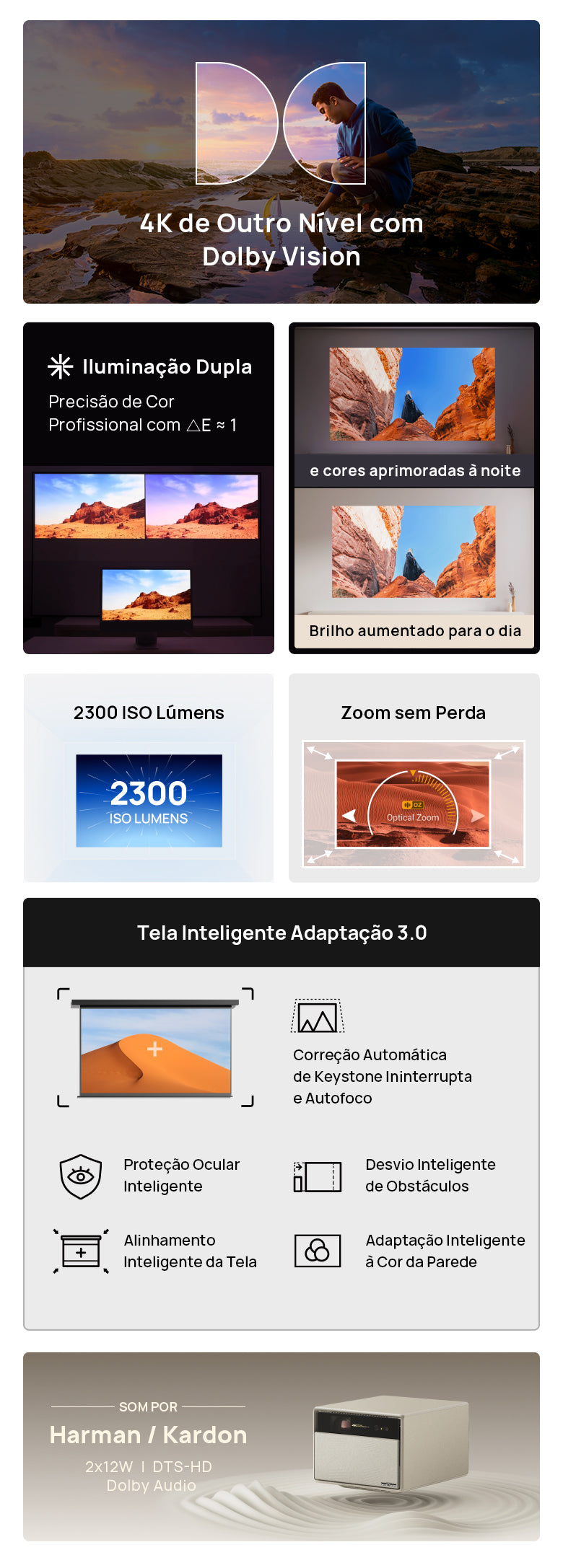 - Adaptação inteligente de tela 3.0: Nossa tecnologia ISA atualizada otimiza suavemente a adaptabilidade ambiental do projetor, o uso fácil, o ajuste da cor da parede, o zoom óptico e outros recursos ISA como nunca antes!